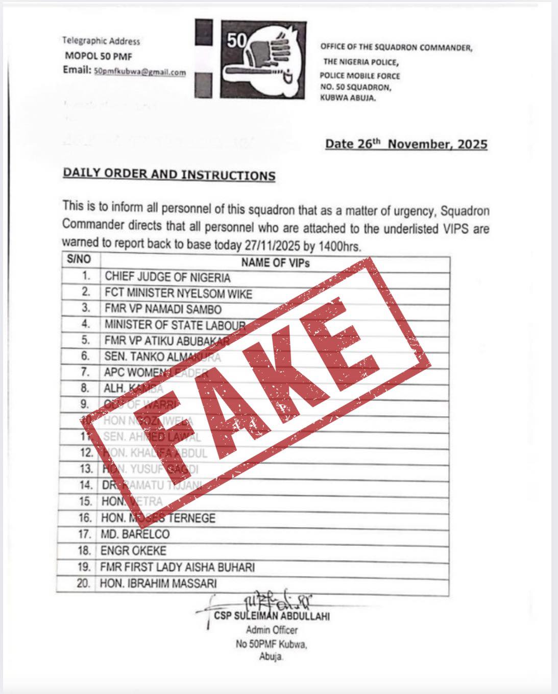 The Nigeria Police Force has dismissed a document circulating on social media claiming that officers attached to selected individuals have been ordered to return to the 50 Police Mobile Force (PMF) Squadron in Abuja.